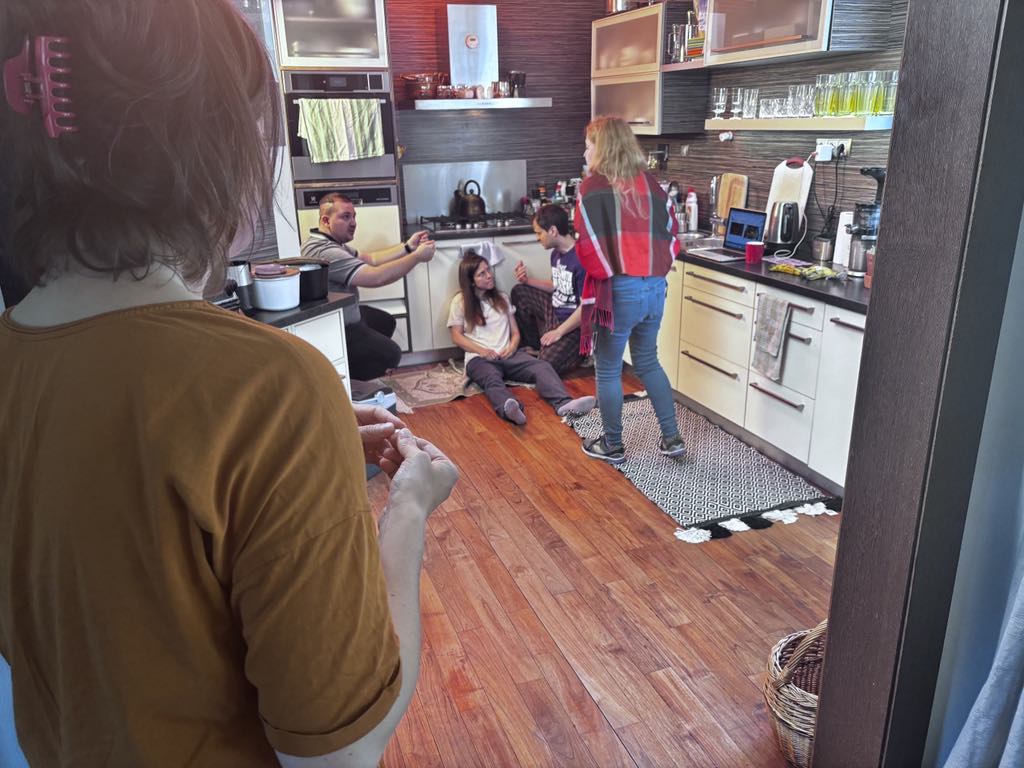 „Én egy fasza angoltanár vagyok. Nekem ez megy”… Kemény világot élnek a szabadúszók.  /// Nem nehéz olyan történeteket elmesélnünk, amik saját életünkből fakadnak, és még sokakéból, akik szabadúszóként élnek… nem tudják, mikor vezetnek be egy új adót, meddig marad a miénk a munka, amin éppen dolgozunk, és mit tehetünk, ha technikai problémába ütközünk az online tanítás során. Milyen abszurd ez az egész, ugye?  /// Élveztem forgatni ezt a rövidfilmet… Találtunk egy nagy konyhát a Rózsadomb tetején, ezért muszáj volt a belsőt kicsit „lelakni”. Natasával az éppen forgó Östlund film szetjében találkoztam, sorba álltunk a jelmezeknél. Megkértem, hogy szerepeljen a vizsgafilmemben. Jó volt vele próbálni és átvenni együtt a könyvet…. Ernő ismert kísérleti zenész, szívesen csatlakozott. Meglepett szórakoztató arcjátékával és csodálatos megoldásaival. Korábban már dolgoztam Évával, tudtam, hogy fantasztikus lesz a puffogó szomszédnő szerepében. Az ő mondatai minden alkalommal megnevettetik a nézőket.  Két napig forgattunk. Az operatőrünk, aki az utómunkálatokat is végezte, éppen lázas beteg volt. Elmondhatom, hogy megmentette a projektet azzal, hogy nem mondta le a forgatást, így két nap alatt elkészültünk.